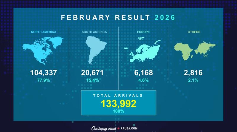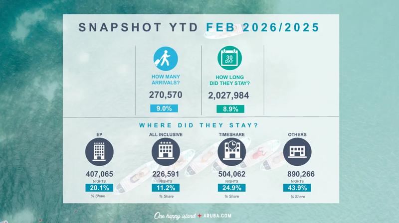 Den luna di februari 2026, Aruba a ricibi un total di 133.992 bishitante stayover, mientras cu e cantidad total di nochinan di estadia a yega 963.552. Esaki a resulta den un promedio di estadia (Average Length of Stay – ALOS) di 7,2 anochi, cu ta refleha un mescla consistente di duracion di estadia y tipo di biahe durante e luna.