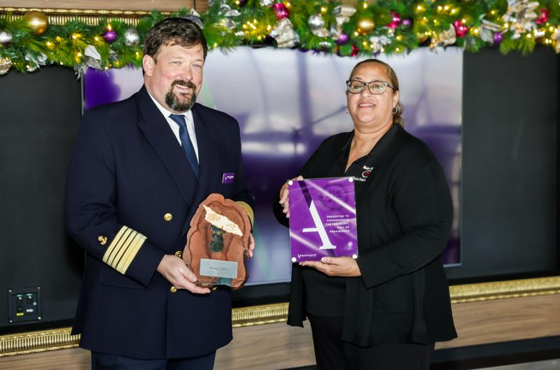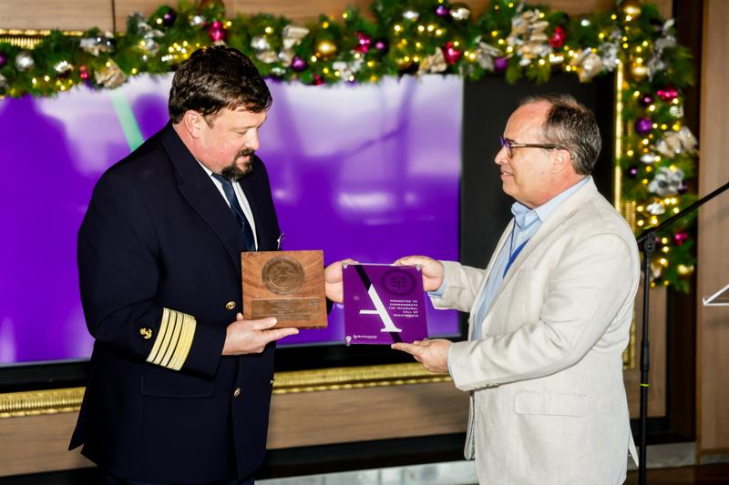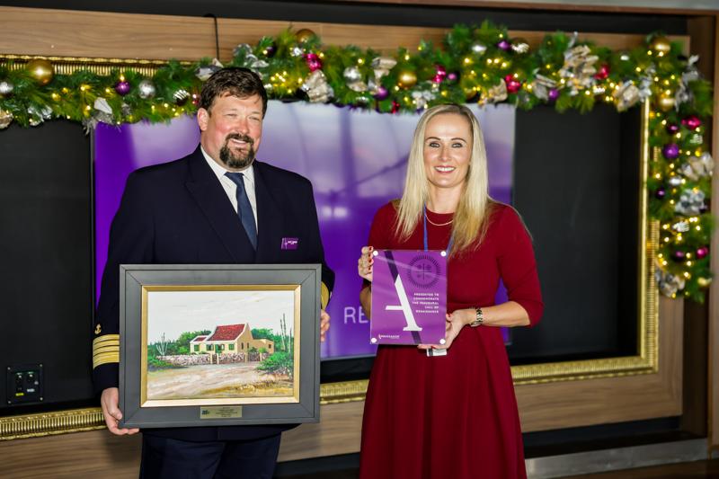 Pa honra e bishita inaugural, un ceremonia di intercambio di plakkaat a tuma lugar abordo di e barco. E tradicion maritimo aki ta simbolisa colaboracion y fortalecemento di laso entre e compania di crucero y e destino. Representando APA NV na e ceremonia tabata Mario Arends, Chief Commercial Officer, conhuntamente cu Monica Bos, Cruise Manager, di A.T.A., y Maureen Palm representando agencia di waf Maduro & Sons. Capitan Simon, un lider maritimo cu tin hopi experiencia y cu a bishita Aruba durante decadanan, tambe tabata presente na e ceremonia.